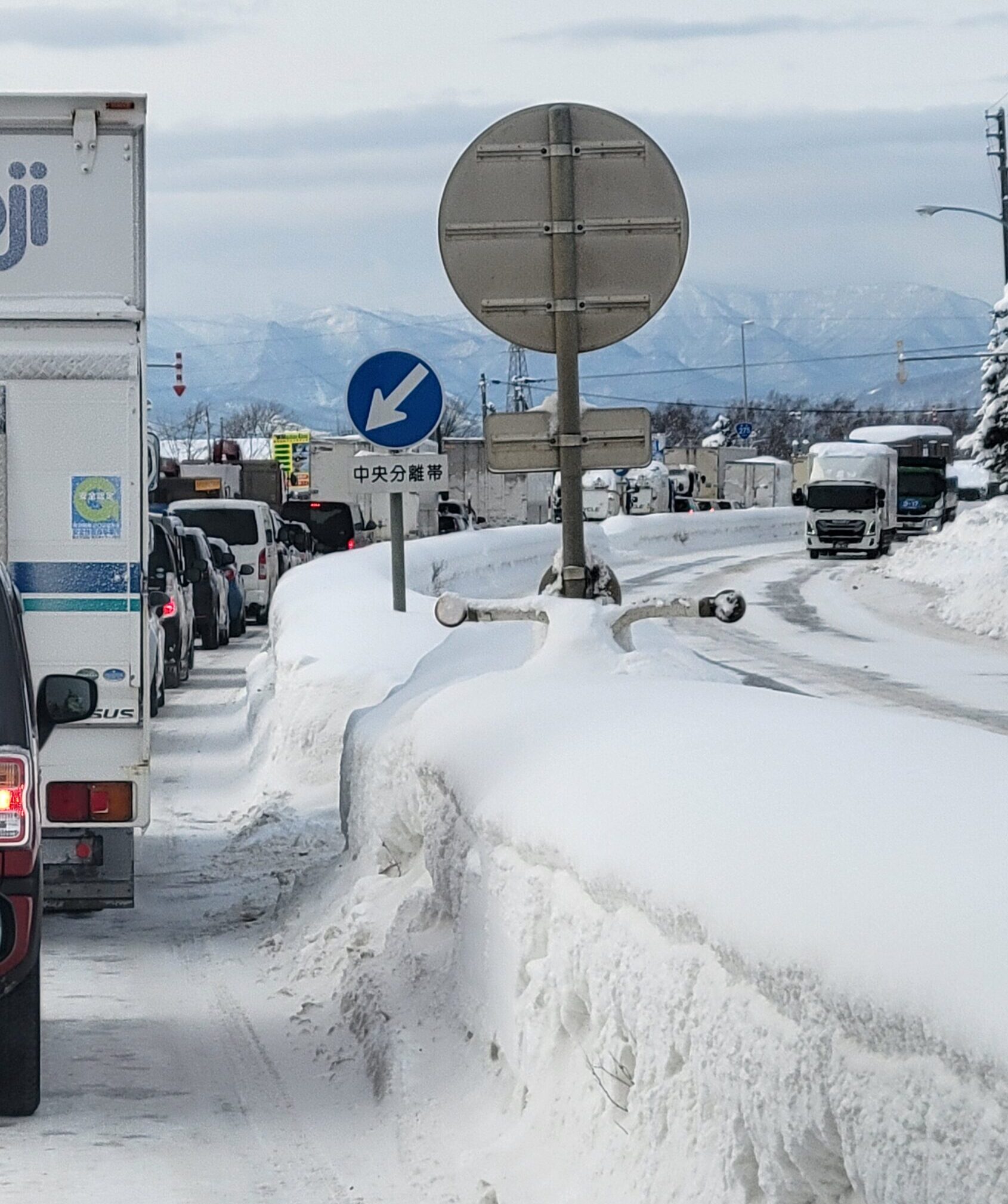 雪の壁に囲まれた道路で、動かない時間だけが積み重なっていきます。